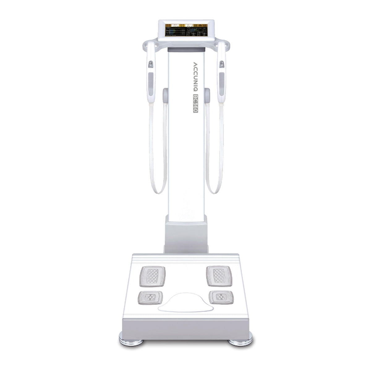 Bioimpedenziometro multifrequenza (5-50-250 kHz) con 8 elettrodi tattili per analisi composizione corporea intera e segmentale: massa grassa, magra e molle, acqua corporea e valutazione grasso viscerale.